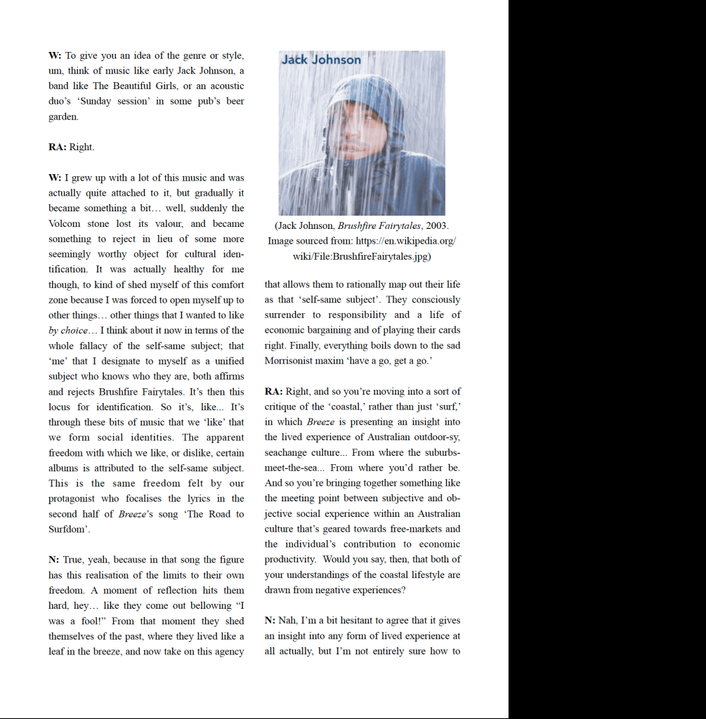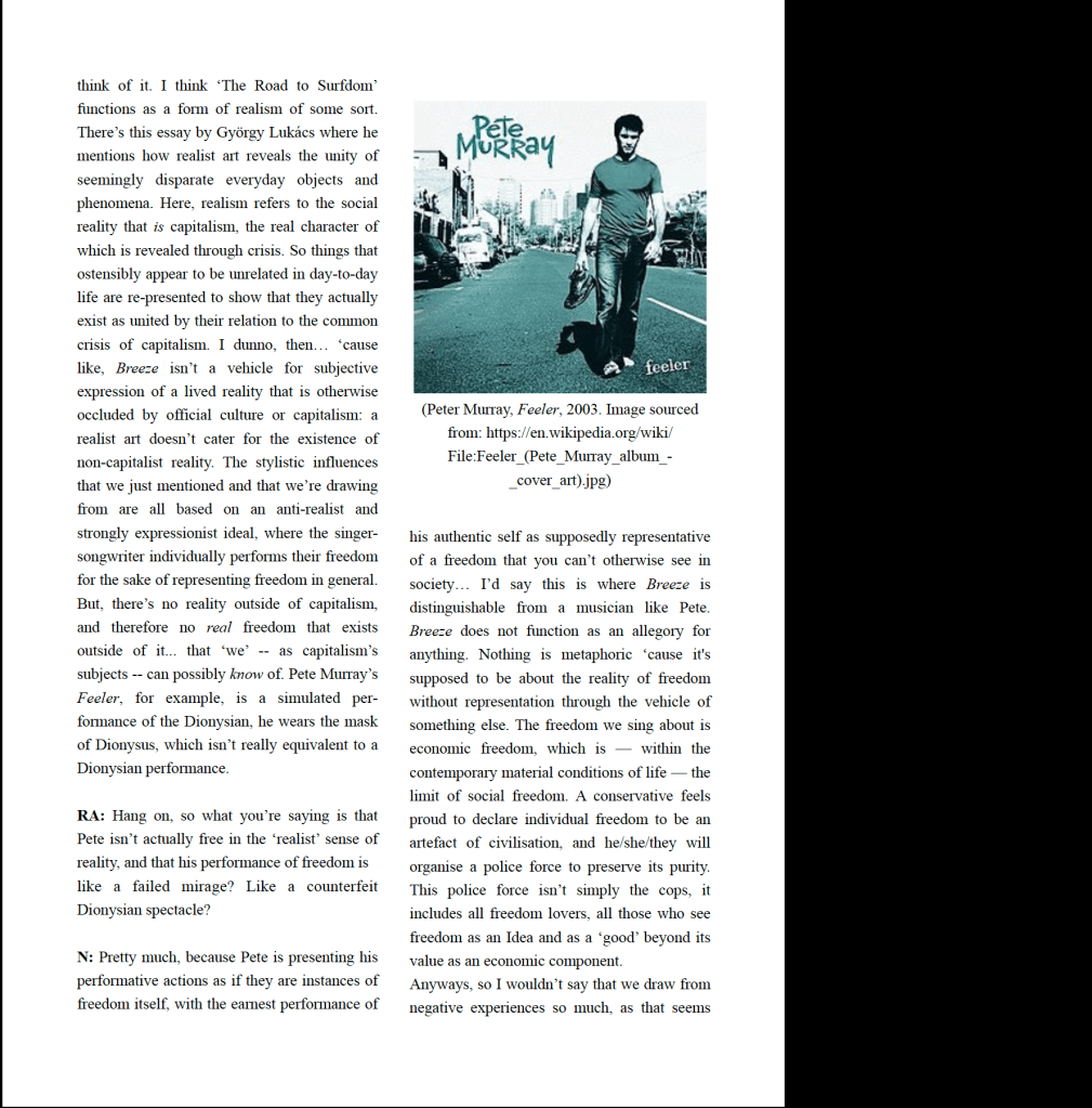 From the peak of Mont Pèlerin you can check the swell, while the nor’easter howls onshore at the end of history. Breeze reflectS upon popular representations of middle-class suburban life on the coast of New South Wales, Australia, Breeze takes the form of a soft-rock band that’s committed to the question of freedom. In the wake of 2020’s global economic upheaval, hostilities emerged around the uncertain status of individual liberties, while in the meantime, Australians were segmented into crisp economic categories: you’re either a JobSeeker, JobKeeper, or JobMaker. Produced during the teething phase of the new-same future pre-eminently called ‘COVID-normal’ the artists Nic and Will present “The Road to Surfdom”— a playfully nihilistic pop art venture that forms a considered fragment of neoliberal realism.